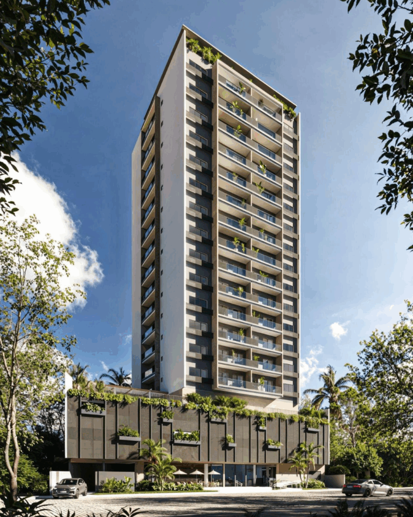 Já a parte estrutural do prédio leva a assinatura da arquiteta Ruana Manhães. A fachada do edifício adota uma paleta neutra em tons de cinza e branco, buscando atemporalidade e elegância discreta. Em contraste, o verde das áreas ajardinadas reforça a conexão entre o ambiente construído e a natureza, especialmente nos espaços de convivência. Um dos grandes destaques do projeto é a cobertura, que oferece áreas de lazer com vistas privilegiadas da cidade. Cercado por um jardim que percorre todo o perímetro, esse pavimento oferece piscina, espaço para eventos, churrasqueira e academia.