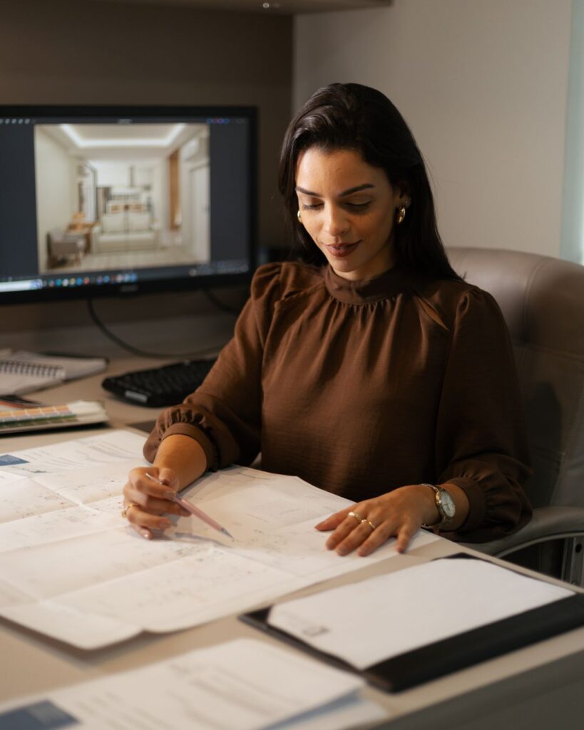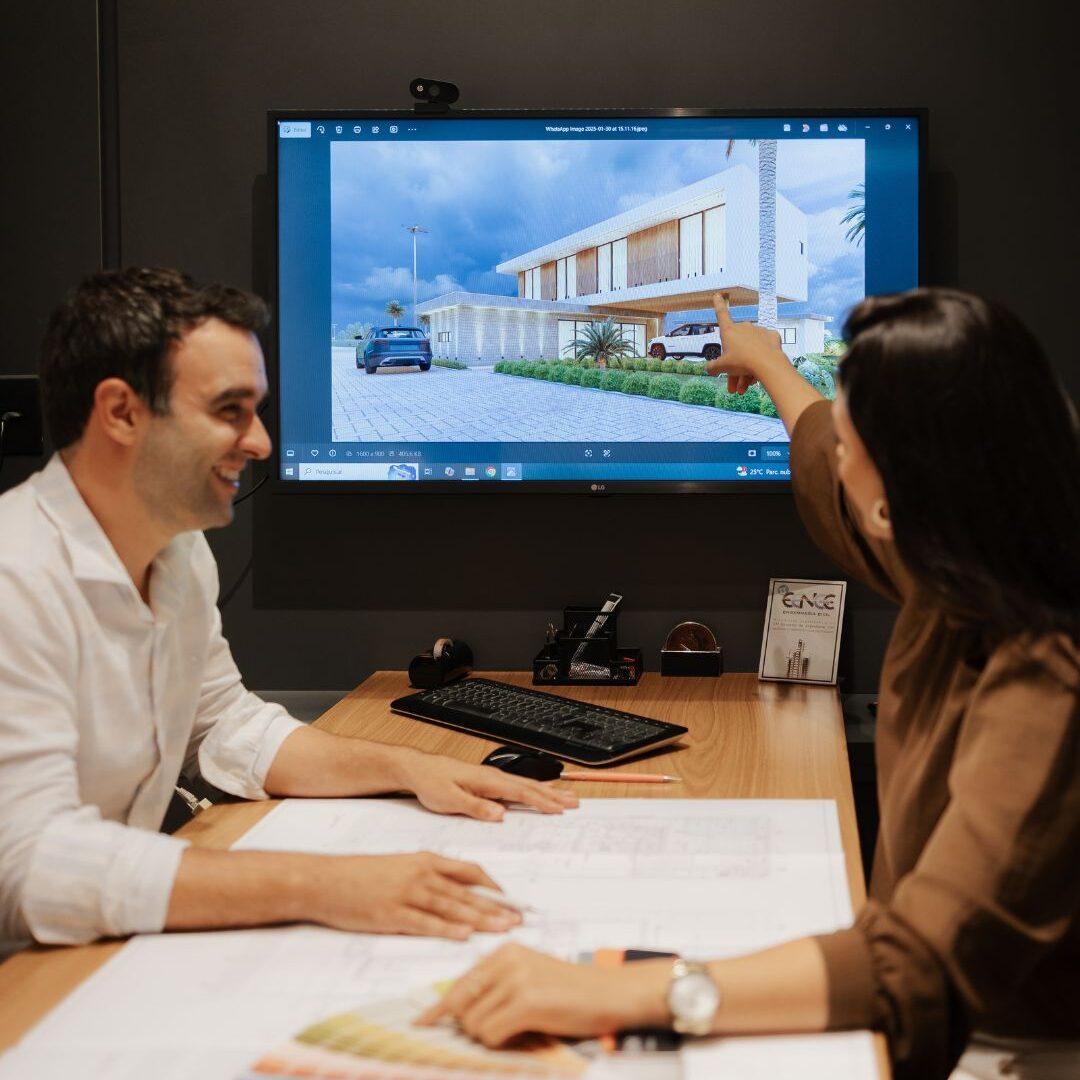 Letícia – Nós oferecemos desde projeto arquitetônico, interiores, administração de obras e consultoria. Damos total suporte ao cliente, desde o primeiro contato até a finalização da obra. A primeira etapa é sempre o projeto arquitetônico, seguido pela aprovação na prefeitura. Depois disso, iniciamos o projeto de interiores, com desenvolvimento de imagens em 3D, detalhamento de marcenaria, bancadas, pontos elétricos, entre outros. Eu acompanho o cliente nas lojas para escolha de revestimentos, tintas e acabamentos. Nosso objetivo é que o cliente se sinta amparado em todas as fases.